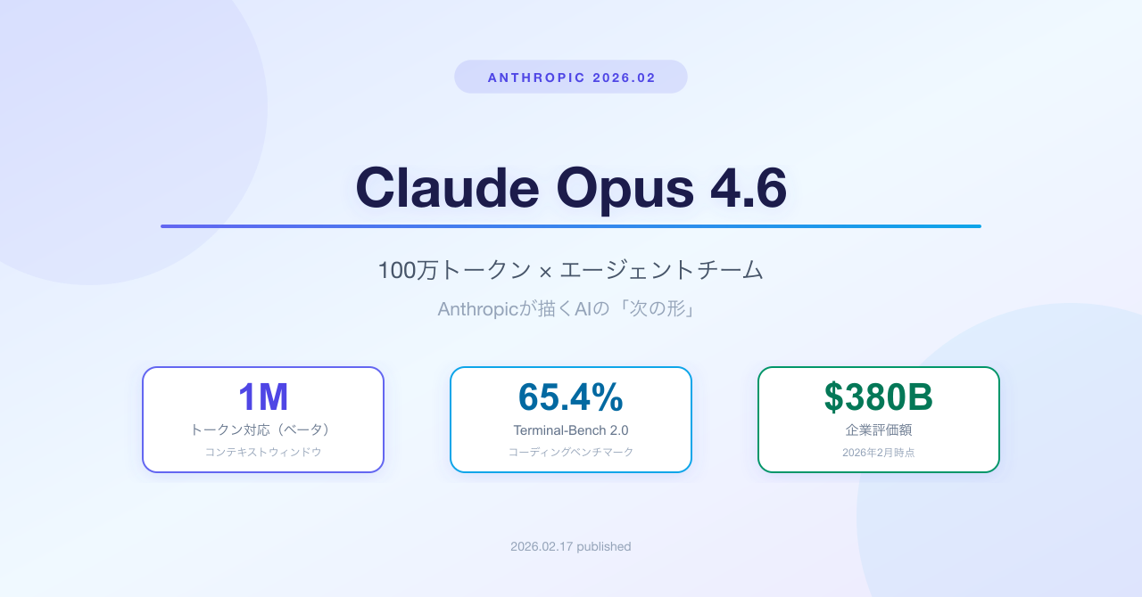 2026年2月5日、AnthropicはフラッグシップAIモデル「Claude Opus 4.6」を公開しました。前モデルからわずか2ヶ月でのアップデートは、AIの進化が年単位から月単位へと加速していることを示すものです。最大100万トークンのコンテキストウィンドウ(ベータ)、複数AIが協調して動く「エージェントチーム」機能、そしてコーディング分野を超えた知的業務全般へのリーチ拡大──。この発表は単なるモデル更新ではなく、AIアシスタントの役割そのものを再定義する宣言だと言えます。