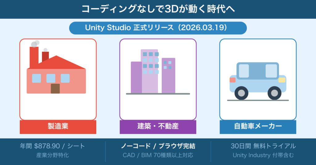 2026年3月19日、Unity Technologies はブラウザで完結するノーコード3Dエディター「Unity Studio」を正式リリースしました。価格は1シートあたり年間878.90ドル(税込)。日本円にすると、為替にもよりますが13万円前後です。30日間の無料トライアルも用意されています。
